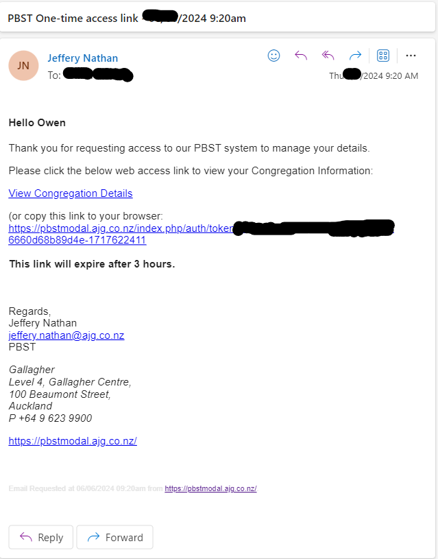 If your email address is registered you will receive an email that looks like this: (You can click on the link labelled 'View Congregation Details' or copy the second link into your web browser window and open. They go to exactly the same place.)